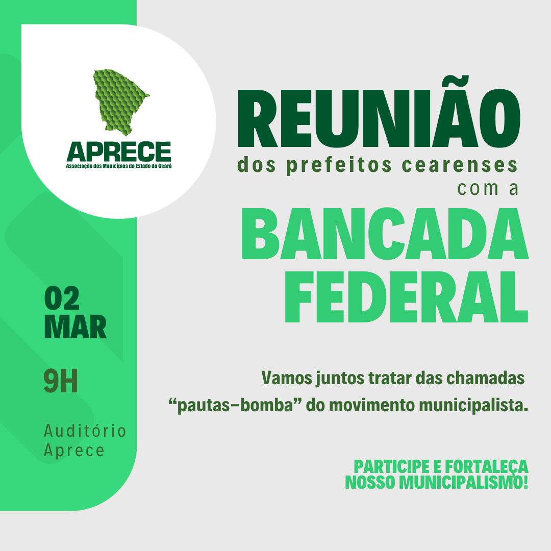 A Associação dos Municípios do Estado do Ceará (Aprece) realiza, no próximo dia 2 de março de 2026 (segunda-feira), às 9h, em seu auditório, em Fortaleza, uma reunião de prefeitos e prefeitas com a Bancada Federal do Ceará. O encontro será conduzido pelo presidente da Aprece, Joacy Júnior, e pelo coordenador da Bancada Federal Cearense, deputado Domingos Neto, reunindo prefeitos(as), deputados federais e senadores do Estado para dialogar sobre matérias em tramitação no Congresso Nacional que podem gerar impactos fiscais expressivos aos municípios.